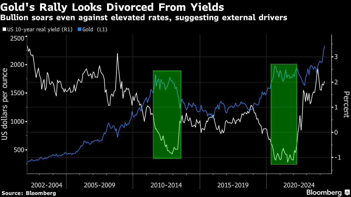 Gold's torrid rally last week, which saw the precious metal tear above $2,300 an ounce, took plenty of onlookers by surprise as Treasury yields rose — typically a headwind for bullion. The conundrum suggests stronger factors at play, with robust central bank buying and increasing consumer demand in China adding to gold's momentum. While a short-term correction may loom at current overbought levels, the outlook is mostly bullish. Soft futures positioning suggests there's room for more speculative juice that could fuel further gains, while the much-anticipated Fed pivot to lowering rates — when it happens — is likely to see investors flock to gold-backed exchange-traded funds again after months of outflows.