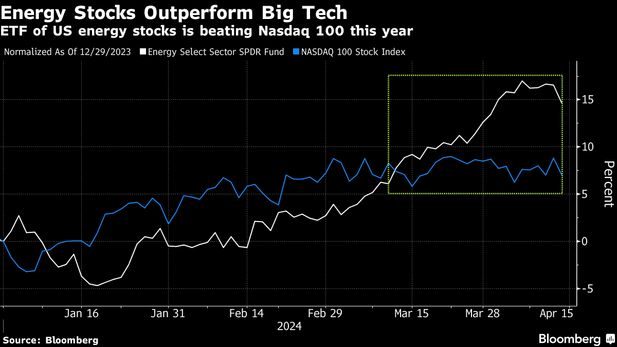 A strong oil-fueled rally in energy stocks is gathering momentum, helping them outperform technology indexes this year. The closely watched Energy Select Sector exchange-traded fund, or XLE, is up nearly 15% since the start of the year, while the Nasdaq 100 Index has gained just 7%. Rising oil has helped, after West Texas Intermediate crude broke above $80 a barrel in mid-March. Energy has led the S&P 500's 11 market sectors since the start of March, rising more than 11% compared with the next closest group, communication services, at 5.8%, and the 0.3% decline in the broader index.