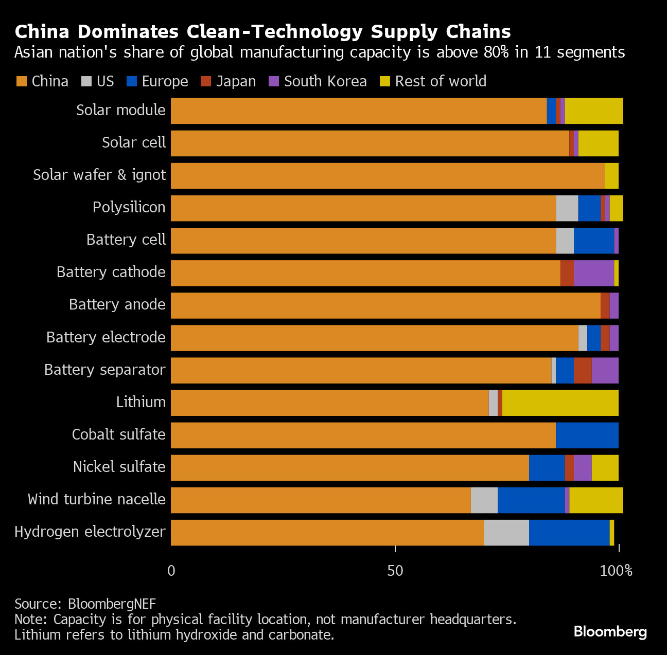 The world's dependence on China has increased for technologies needed to support a global transition away from fossil fuels, according to BloombergNEF. Breakneck spending has pushed China's share of global production capacity above 80% in 11 clean-technology value chain segments. China's capacity is set to far surpass global demand across solar, batteries and electric vehicles for years to come. Supply chains for clean energy will be among the topics discussed at BNEF's summit on Tuesday and Wednesday.
