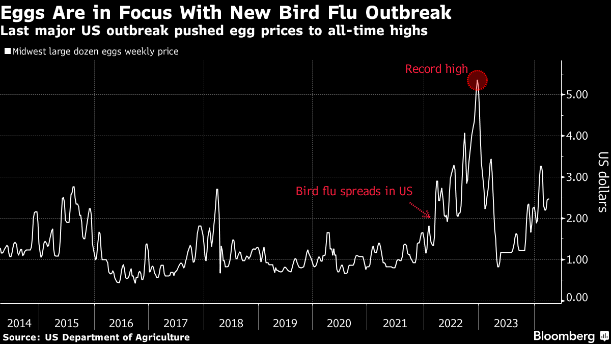 Bird flu is flaring up again: The top US eggs producer reported this month the worst American outbreak since December while the highly pathogenic avian influenza virus made the jump to dairy cattle. Egg prices so far have held relatively in check, but there are expectations they could rise again with more egg-laying chickens potentially catching the virus amid peak migration season for wild birds. The worst-ever outbreak has never fully abated since it was first detected in the US in February 2022.