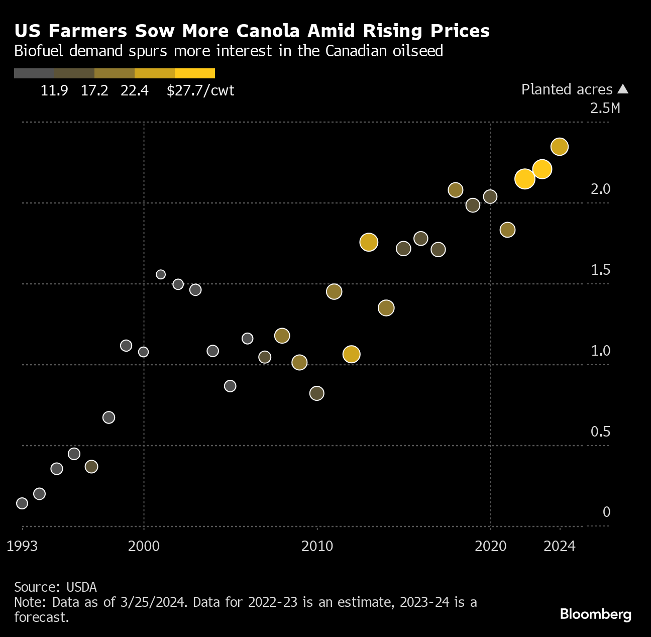 After decades of slow progress, winter canola is getting a new chance to take off in the US, thanks to the crop's potential as a source of renewable diesel and jet fuel. Canola has a much higher oil content than soy, which under the right growing conditions, makes it an ideal raw material for biofuels. Along with states like Kentucky, Tennessee and Kansas, there is an attempt underway to plant winter canola in Illinois, the biggest US grower of soybeans — which yields about half the oil as canola.