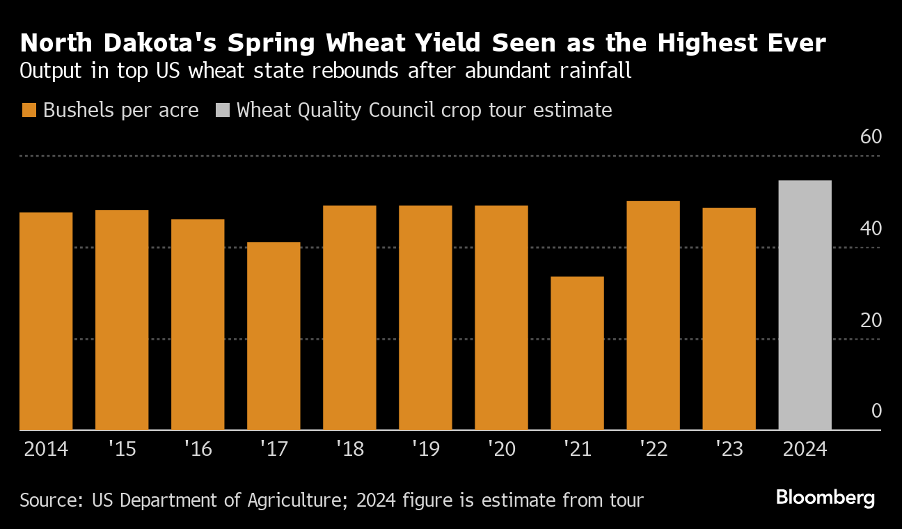 Record-high wheat yields in the US Plains state of North Dakota are set to further expand American grain supplies. Dozens of wheat traders, millers and bakers who traveled across the state in an annual crop tour last week found lush wheat fields thick with tall, green plants — a good sign for US exports. American farmers have been reaping bumper grain crops, helping to bolster global output.