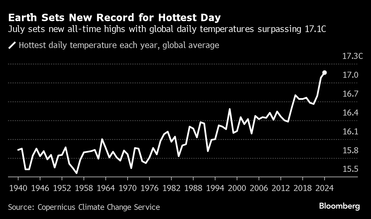 The world keeps heating up, with global average temperatures already hitting or exceeding a key climate threshold for 12 months — highlighting the challenge of limiting global warming to below 1.5C above the pre-industrial era. The highest average daily temperature on Earth keeps setting new records, at one point rising above 17.1, according to provisional data from the European Union's Copernicus Climate Change Service. Climate change is increasing the frequency and intensity of heat waves, bringing extreme weather events from flooding to wildfires and causing havoc to commodities markets such as agriculture and energy.