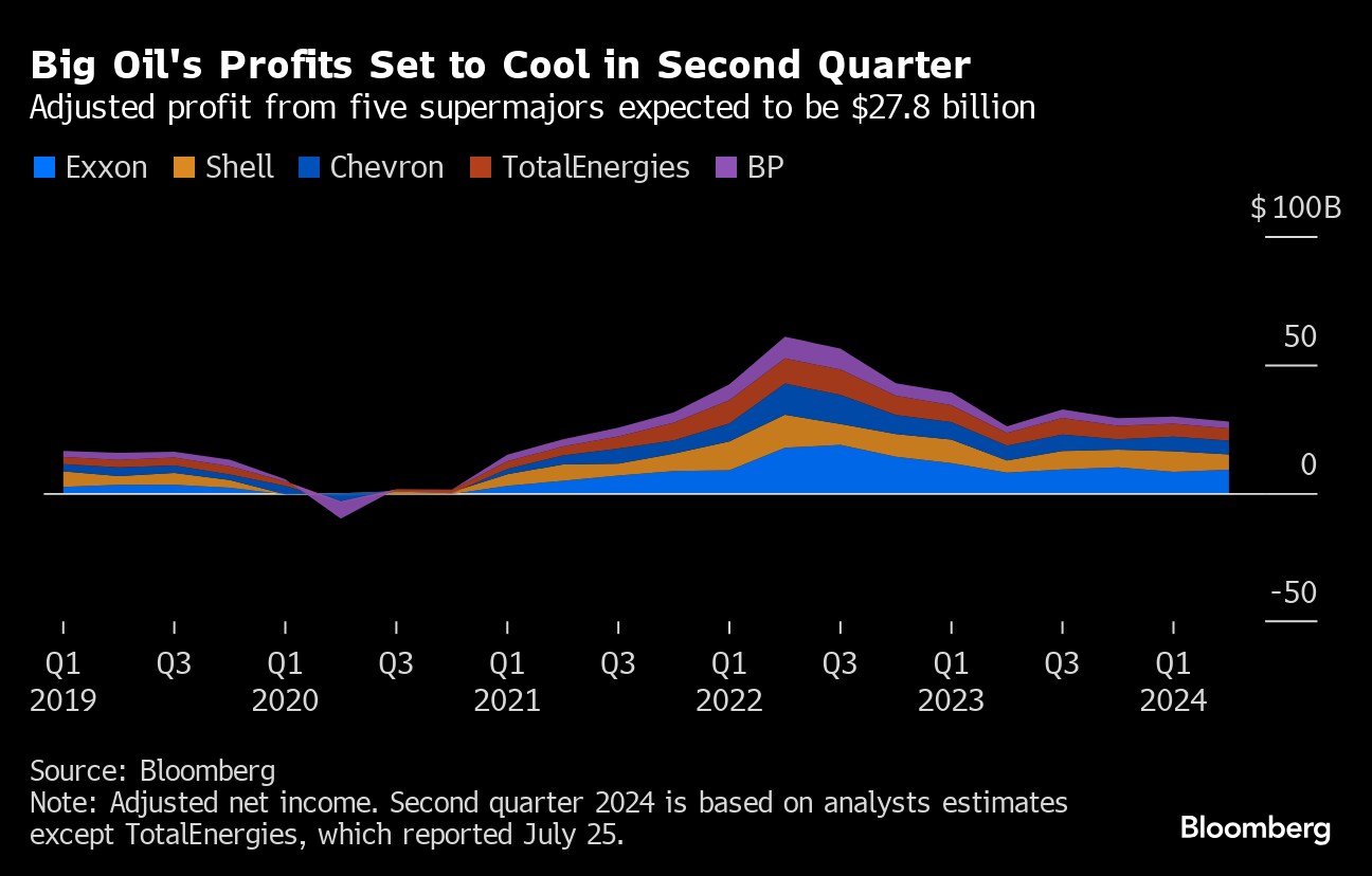 Big Oil's quarterly earnings season continues with four supermajors reporting second-quarter results this week. TotalEnergies SE has already given a hint of what's to come, after posting a bigger-than-expected profit drop last Thursday due in part to weaker refining margins in Europe and the Middle East. BP Plc and Shell Plc release results Tuesday followed by Chevron and Exxon on Friday. The five energy giants are collectively forecast to report $27.8 billion in adjusted net income for the period, 6.6% lower than the first quarter, with refining margins expected to be a drag on results.