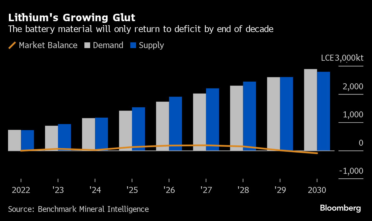 With lithium prices near three-year lows and showing no signs of a recovery, attention is turning to whether miners will be forced to rein in supply of the battery metal. The price of the metal vital to the energy transition has plunged 86% since November 2022, and Benchmark Mineral Intelligence sees the current glut deepening through 2027. Lithium remains in the doldrums due to slowing growth in electric-vehicle adoption and increased supply.