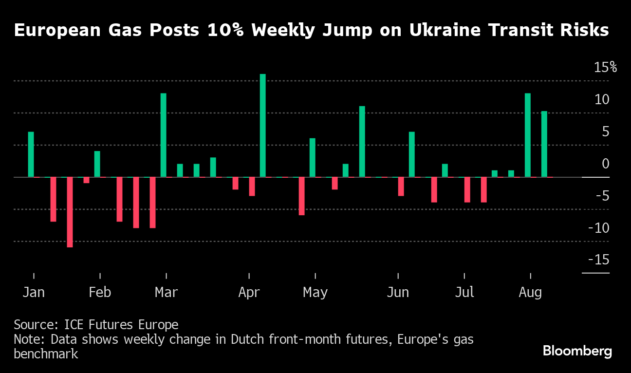 European natural gas prices are staging a rally with two consecutive double-digit weekly advances. An incursion by Ukraine into Russia's bordering Kursk region last week put a key gas transit point at risk. Some European countries, including Austria and Slovakia, rely on Russian gas crossing Ukraine even if Europe as a whole has moved to diversify supplies.