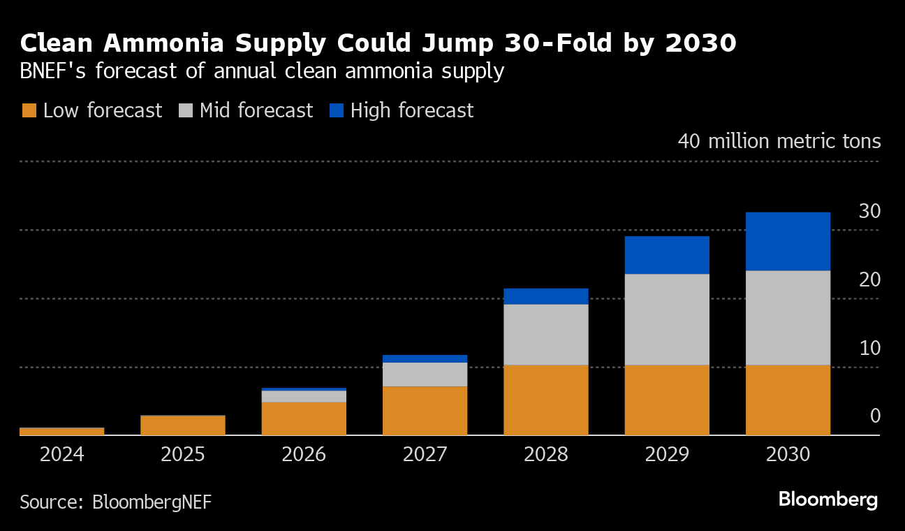 Clean ammonia production could grow as much as 30-fold this decade, making up as much as 13% of global ammonia supply by 2030, according to new research from BloombergNEF. The US is forecast to lead the way in output, with China and the Middle East also contributing to the gains. Quotas, import subsidies, US tax credits and rising Chinese demand are all encouraging the clean ammonia buildout, according to BNEF.