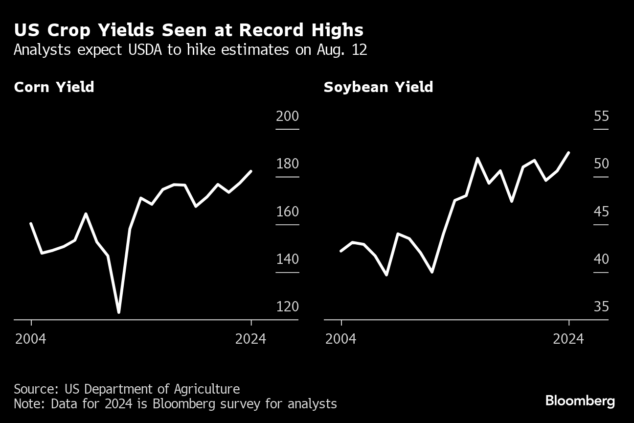 The US Department of Agriculture will publish its monthly supply and demand report on Aug. 12. Traders, on average, expect the agency to hike its already record-high estimates for yields of America's two most widely grown crops: corn and soybeans. There's still a potential for planted acres to come in lower than expected after heavy spring rains flooded some fields. A smaller area would partially offset gains in production estimates that were linked to big yields.
