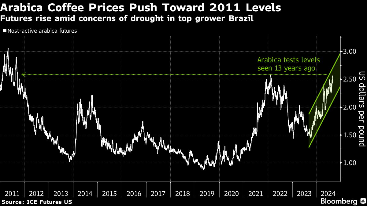 Arabica futures in New York are flirting with the highest levels since 2011 as concerns mount that heat and drought in Brazil, the world's top coffee producer, threatens crops at a crucial flowering stage. Prices briefly pushed to 2022 highs last week, though they've met resistance in breaking through that 13-year threshold. There hasn't been any significant rain in arabica regions since March, according to Regis Ricco, a director at RR Consultoria Rural, which provides agronomic services to several producers in the largest-growing areas of Brazil.