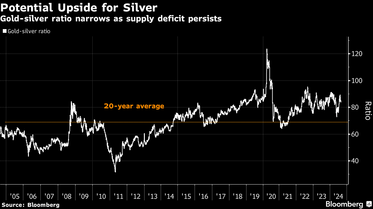 Gold's record-setting ways have caught many investors' attention, but the rally in silver has outpaced the yellow metal. A ratio between the two precious metals shows that cheaper silver may have more room to run as it plays a catch-up trade with bullion's ascent. The ratio shows it now takes about 86 ounces of silver to buy an ounce of gold — well above the 20-year average. Silver is an industrial metal due to its usage in solar panels and electronics, though like gold it can also serve as an inflation hedge.