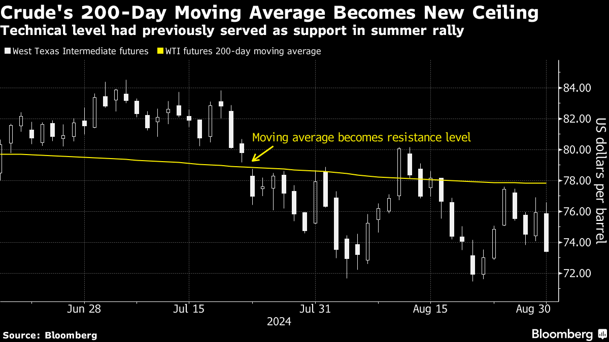 West Texas Intermediate is facing more than fundamental challenges in trying to shake off its current doldrums. In addition to the gloomy economic outlook for China — the world's top crude importer — WTI futures are facing the technical resistance of trying to breach their 200-day moving average. While the fundamental picture, including the prospect of OPEC+ reviving some production later this year, remains the biggest obstacle to crude's gains, technical barriers are becoming increasingly formidable as algorithmic traders play a larger role in the market.