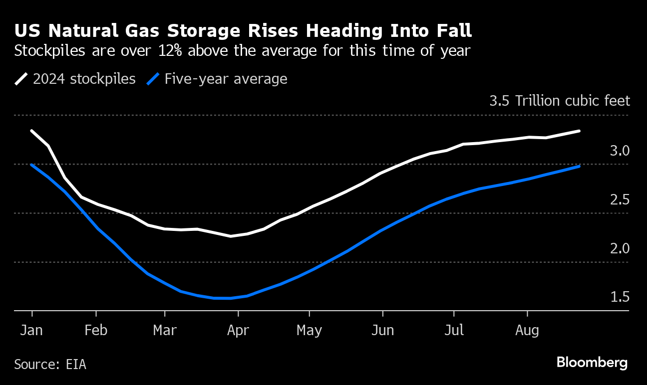 Stockpiles of US natural gas are rising higher than usual as the country heads into the fall — a trend that is reinforcing low prices and extending oversupplies until until bad weather drives up demand. Storage is about 12% above the five-year average after an unusually mild winter damped demand for the heating fuel. A hot summer hasn't been enough to significantly deplete supplies, and traders are waiting to see whether extreme winter weather will bring storage back in line with usual numbers.