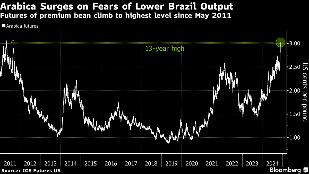 Futures of the premium arabica bean reached fresh 13-year highs, as concerns rise over supplies from top grower Brazil. A strong pace of exports this season out of Brazil, the world's top supplier, is seen draining the country's stockpiles, raising concerns over tightening supplies before the new harvest arrives in July. Fears are also mounting over the size of the crop after dry weather earlier this year hurt trees. Brazil's annual arabica production is expected to slump 11%, according to StoneX's first estimate for the 2025-26 season.