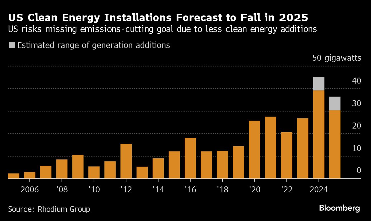 President Joe Biden's push to curb carbon emissions by boosting clean energy output is falling short of expectations. The US is on track to curb greenhouse gas emissions by 30% by 2030, according to estimates from research firm Rhodium Group, which is less than the government's own prediction of a 40% decline in five years. Rhodium researchers say the shortfall is due to lower-than-expected additions of projects such as wind turbines and solar farms — even with 2024's “record-breaking surge” of additions to clean electricity capacity.