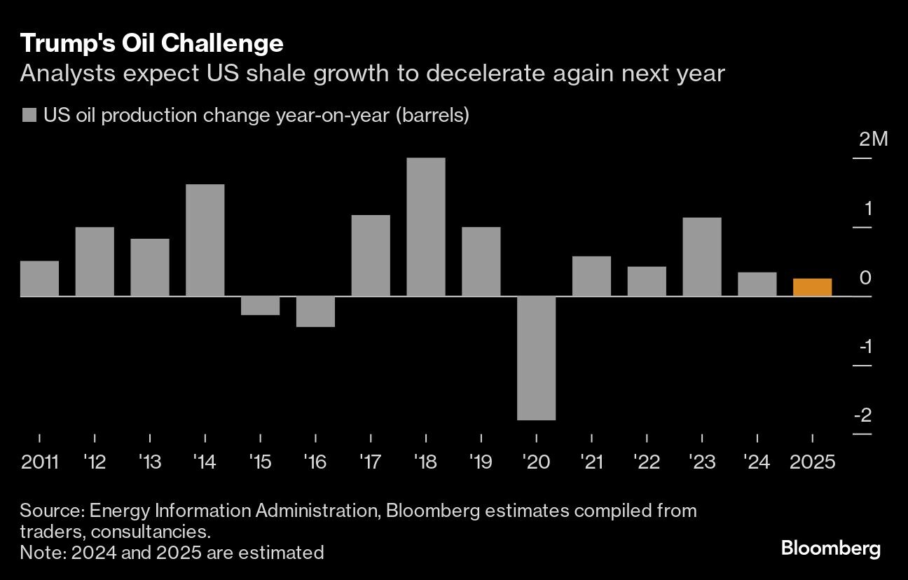 US President-elect Donald Trump's vow to “frack, frack, frack” is about to collide with a global crude oil glut that's set to temper record shale production. Trump has said he'll push America's shale companies to ramp up output, but his second term will follow two straight years of record US output. Against this backdrop, analysts and traders surveyed by Bloomberg see the US adding just 251,000 barrels a day from the end of this year through 2025, the slowest pace since a pandemic-driven drop in 2020.