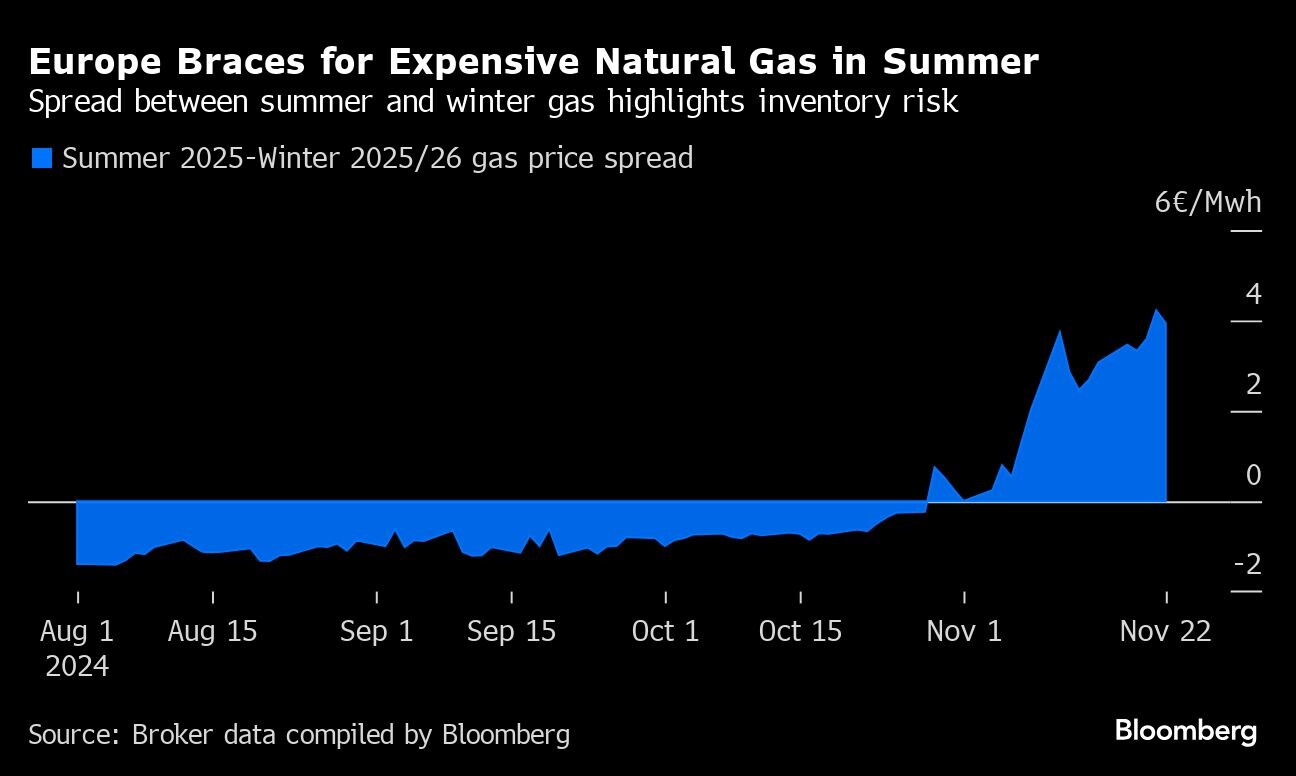 Natural gas is going to be expensive for Europe just when the region will have to work harder to refill its storage sites. Prices for next summer are trading at a premium to rates seen next winter, which can make the next stockpiling campaign more challenging and costly. Europe is actively using inventories at the start of this year's cold winter and faces a loss of Russian gas transiting Ukraine next year, meaning the continent will have to compete with Asia to attract global liquefied natural gas instead.