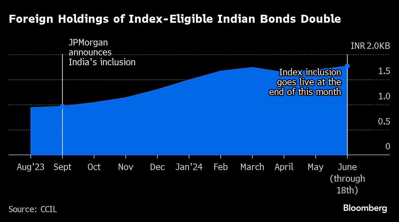 (Bloomberg) -- Foreign investors are returning to Indian bonds after a selloff in April, ahead of the debt's inclusion into a key global index at the month-end.