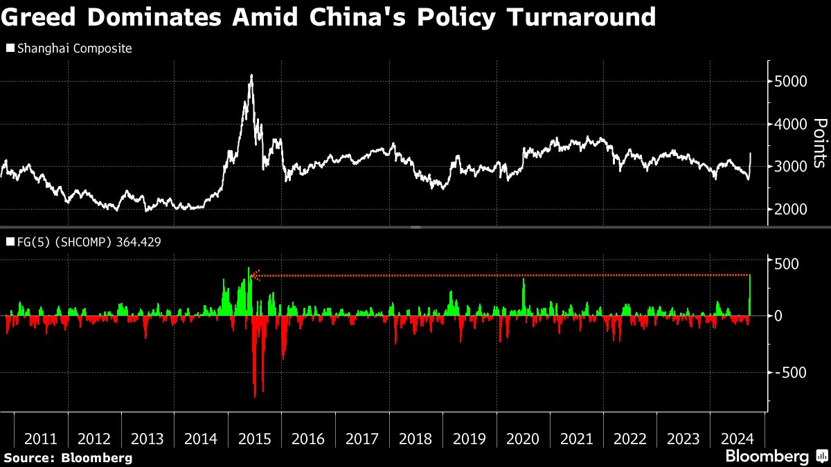 The Fear and Greed Indicator of the Shanghai Composite Index, which measures the buying and selling momentum for the stock benchmark popular among China's retail investors, rose to the highest since 2015 on Monday.