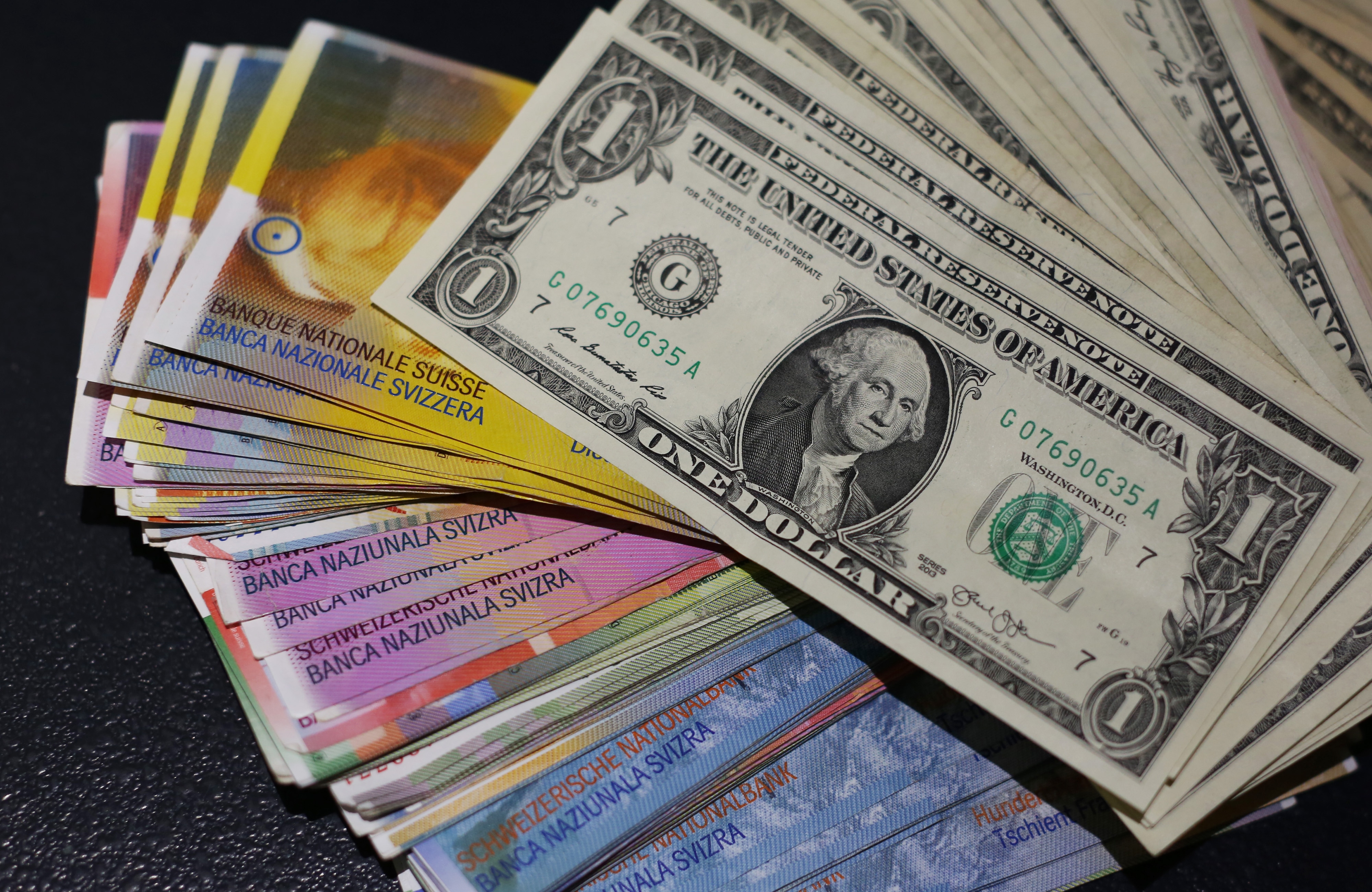 Multiple denomination U.S. dollar bills sit on top of Swiss franc bank notes in this arranged photograph inside a currency exchange store in London, U.K. (Photographer: Chris Ratcliffe/Bloomberg)