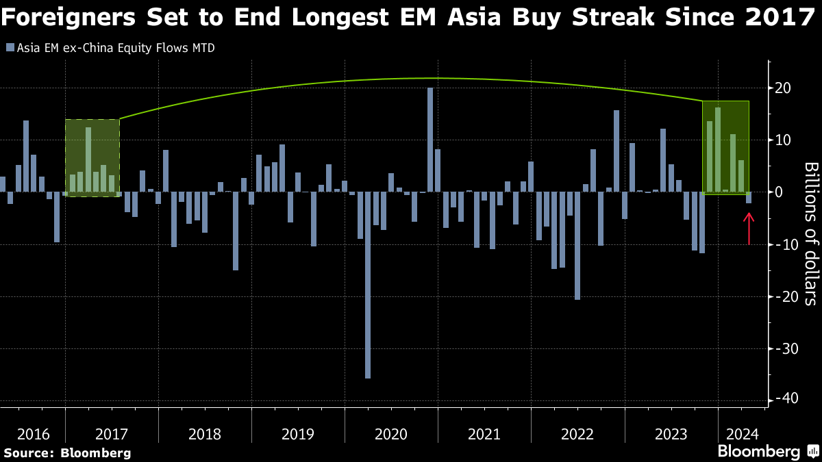 Overseas investors have sold nearly $2.2 billion worth of equities in the region's emerging markets in April, on a net basis, according to data compiled by Bloomberg that excludes China. That will snap the longest streak of purchases going back to 2017.