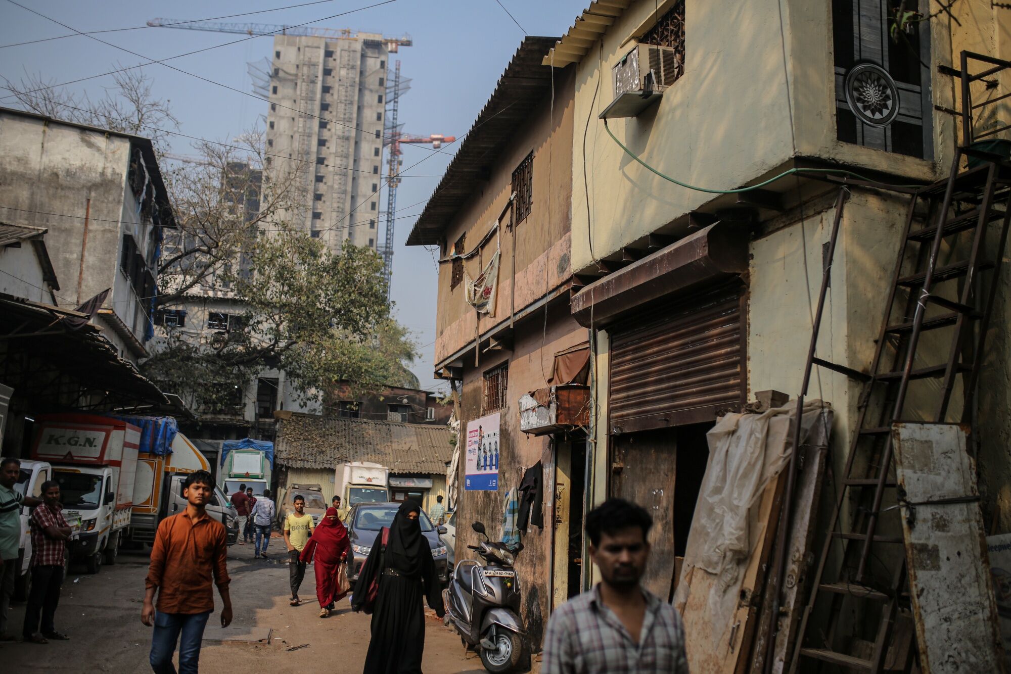 People walk on a street with a residential building under construction in the background in the Dharavi district in Mumbai, India, on Thursday, Jan. 5, 2023. Indian billionaire Gautam Adani's plans to revamp Mumbai's famed Dharavi slum - one of the world’s largest urban renewal projects - could offer a blueprint for how to spur investment into sprawling informal settlements. Photographer: Dhiraj Singh/Bloomberg