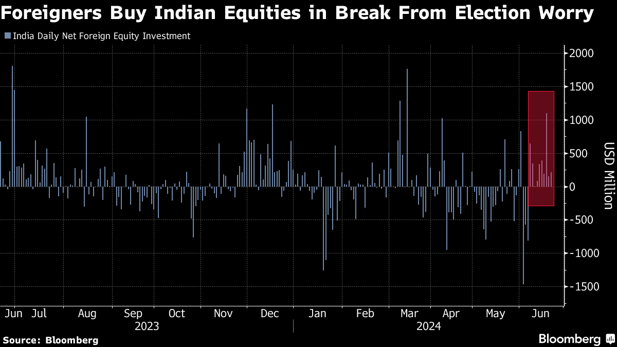 The resumption in purchases by foreigners has combined with strong domestic flows to provide a further boost to an already expensive market. The NSE Nifty 50 Index hit a fresh record last week, as investors cheered a commitment by Modi's new coalition for policy continuity in the world's fastest-growing major economy.