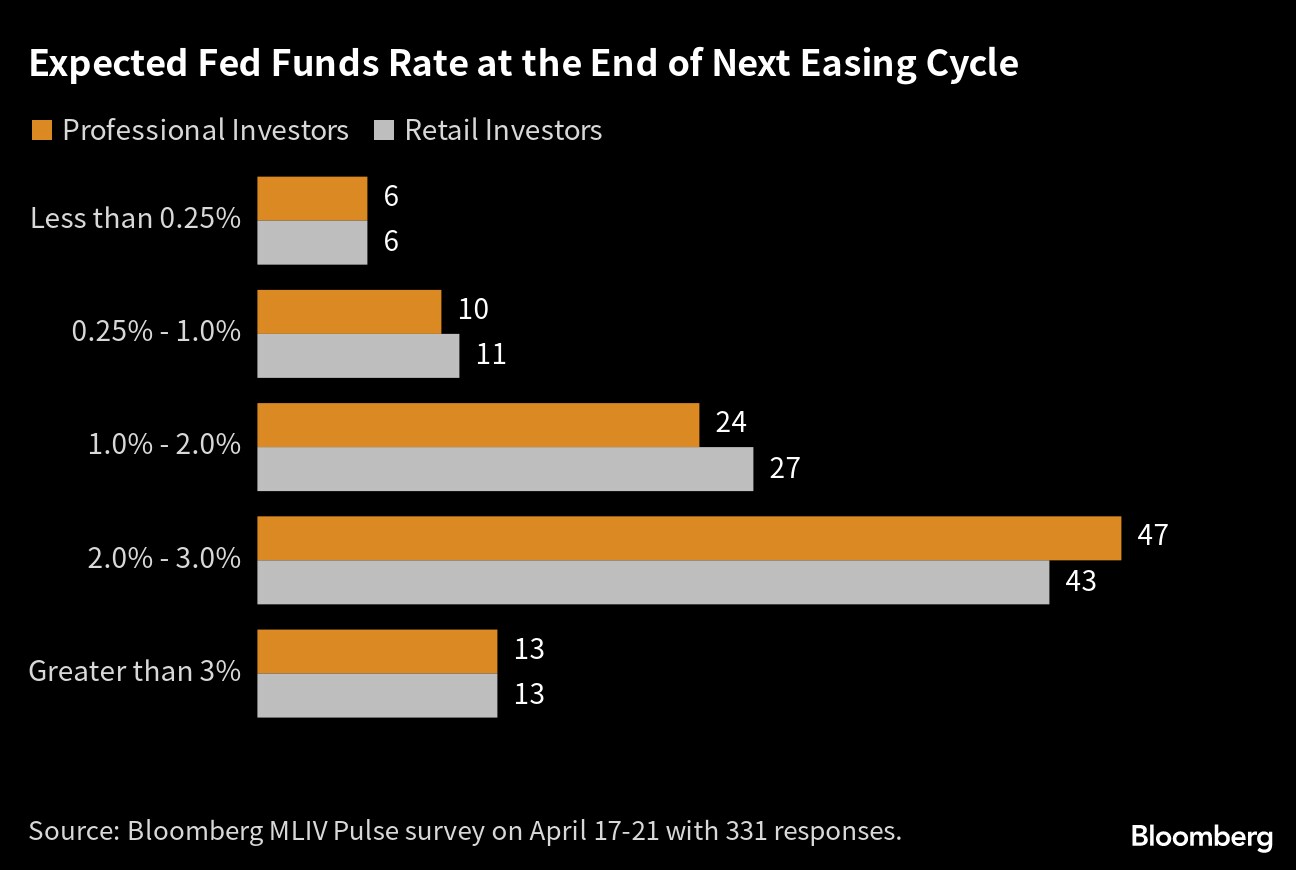 Some 87% of 331 survey respondents expect the Fed to cut interest rates to 3% or below — some significantly so — in a loosening cycle that 40% believe will start this year, according to the latest MLIV Pulse survey. That stands in contrast to market pricing that puts the implied policy rate around 3.05% in two years.
