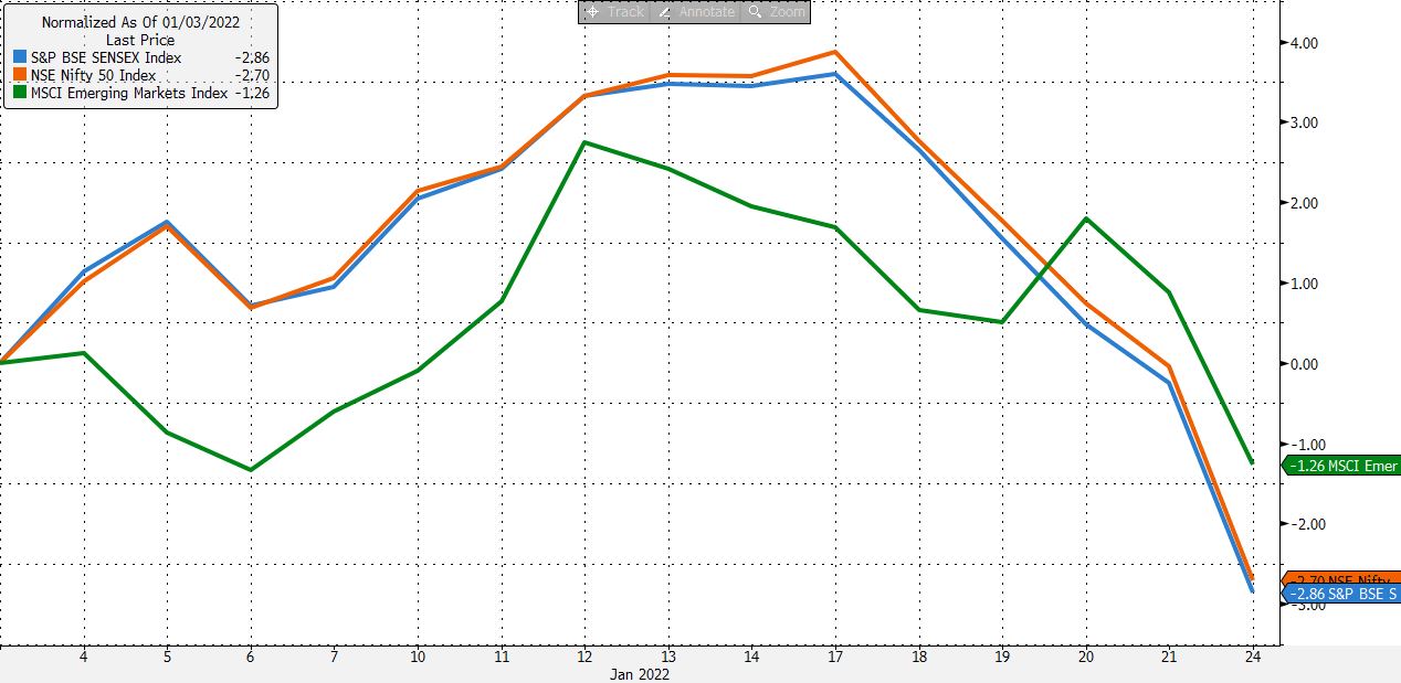 India's stock benchmarks dropped by over 2.5% so far in January. The S&P BSE Sensex and NSE Nifty 50 fell 2.86% and 2.70% over the same period, respectively, compared with a 1.26% drop in the MSCI Emerging Markets Index.