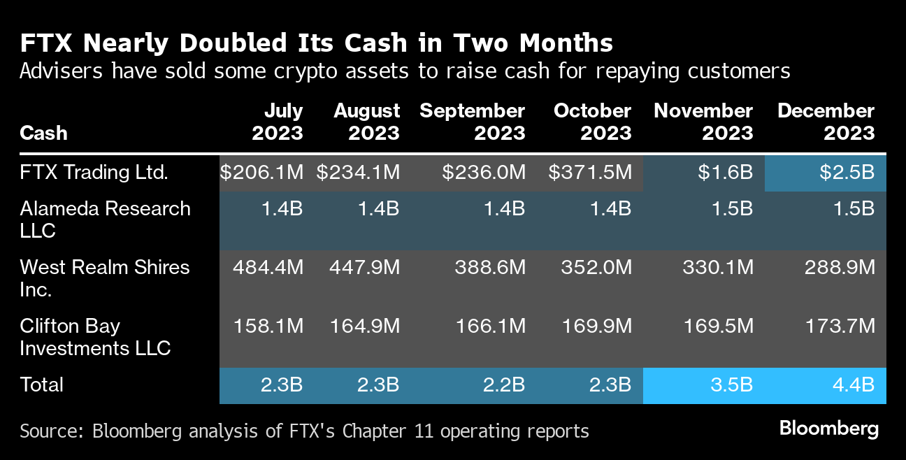 The fraud-tainted crypto firm's four largest affiliates — including FTX Trading Ltd. and Alameda Research LLC — together nearly doubled the group's cash pile to $4.4 billion at the end of 2023 from about $2.3 billion in late October, according to Chapter 11 monthly operating reports. The company's total cash is likely higher including the rest of its affiliates.