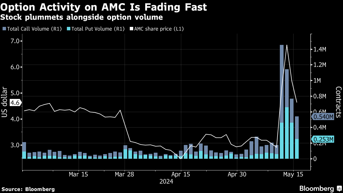 However, conditions are not the same this time around. Options activity for GameStop has declined, while activity around AMC shares has more than halved from Monday's peak.