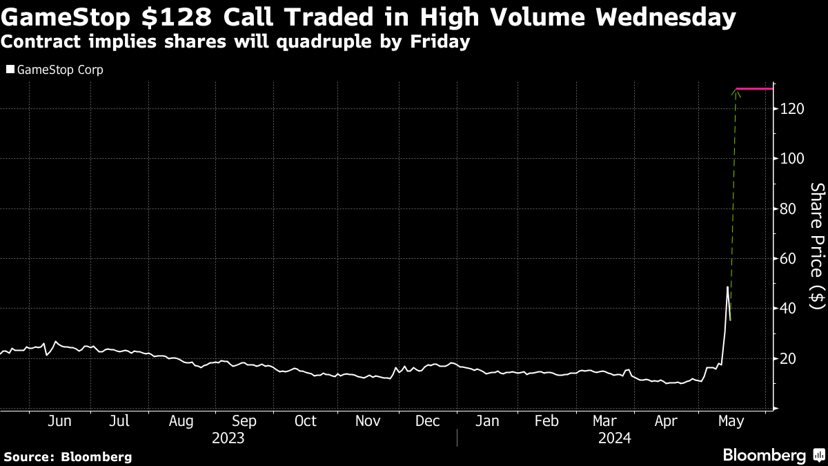 Among the most-traded call options were contracts with $100 and $128 strikes — implying, respectively, a near tripling or even quadrupling in the underlying by Friday. The $128 contract had no open position prior to Wednesday, while the volume in the lower strike exceeded the number of outstanding positions.