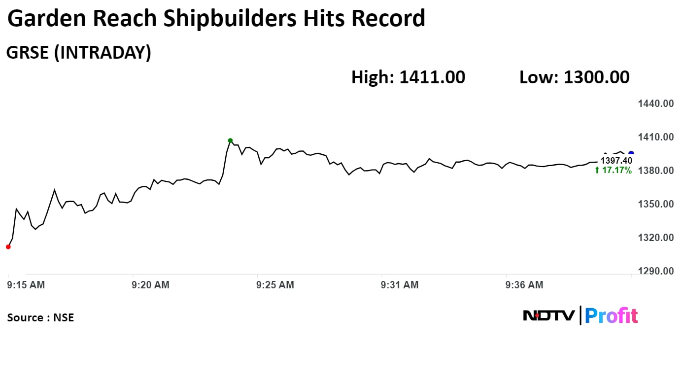 Shares of Garden Reach Shipbuilders & Engineers Ltd. surged over 18% to hit record high on Thursday after its profit more than doubled, beating analysts' estimates in the quarter ended March.
