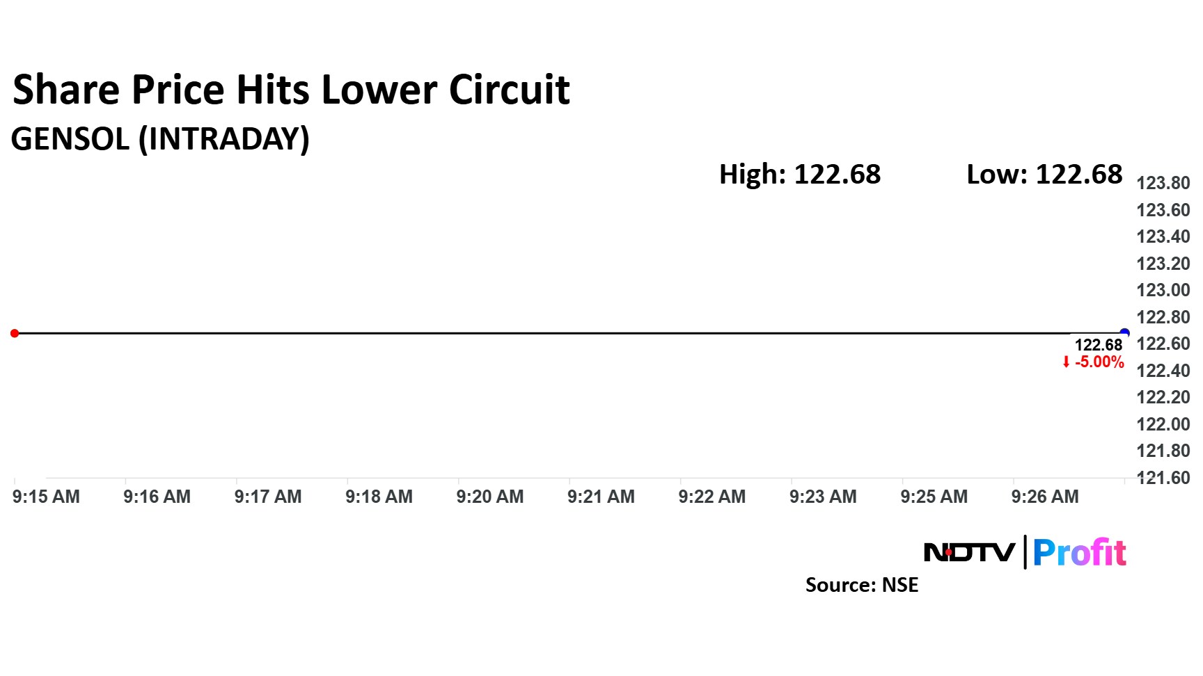 The scrip fell as much as 5% to Rs 122.68 apiece and it continued to trade at the same level as of 09:25 a.m. This compares to a flat NSE Nifty 50.