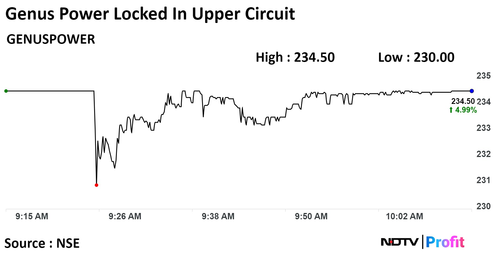 On the NSE, Genus Power's stock was trading 4.99% higher at Rs 234.50 apiece compared to a 0.64% advance in the benchmark Nifty 50 as of 10.44 a.m.