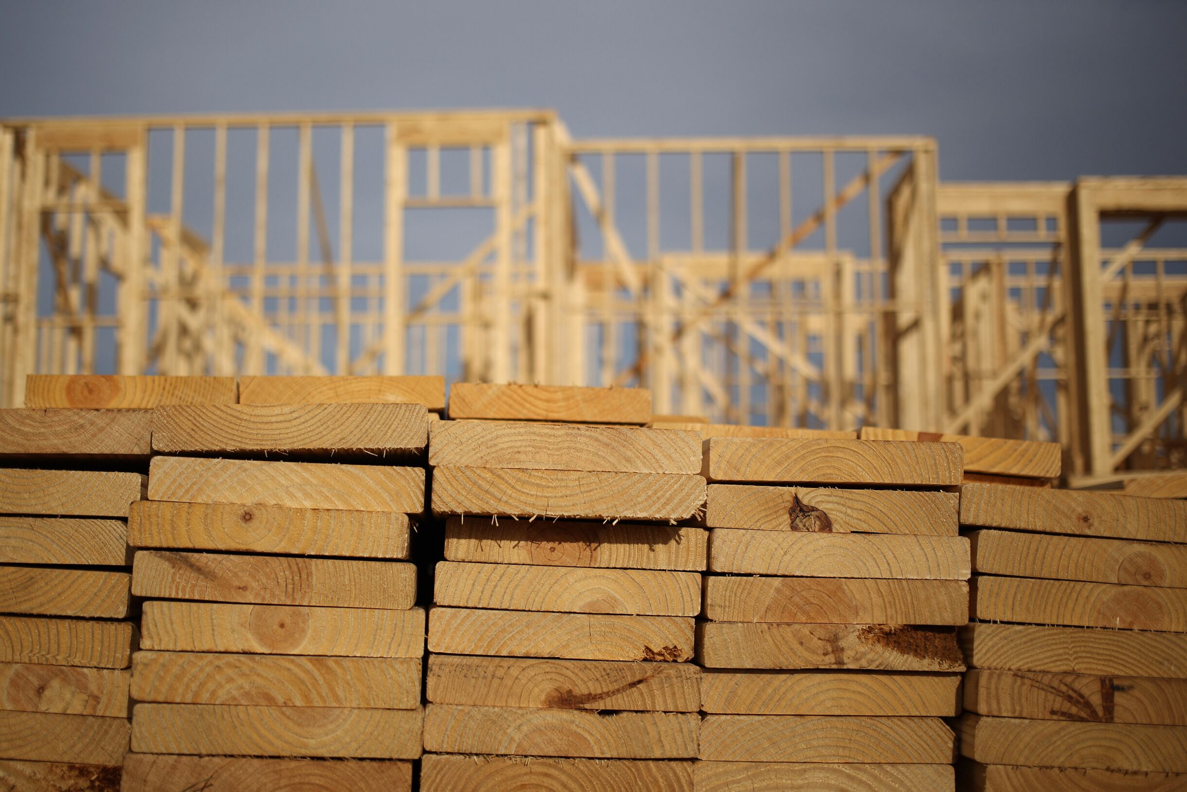 Lumber sits stacked in front of wooden framing during the construction of residential housing in Kentucky, U.S. (Photographer: Bloomberg Creative Photos/Bloomberg)