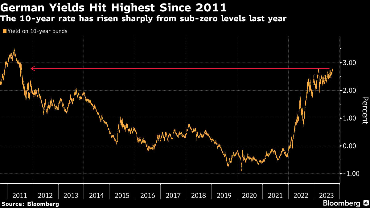 (Bloomberg) -- German government bonds tumbled as investors prepared for interest rates in the euro area to remain elevated for longer, sending the 10-year yield to the highest level in over a decade.