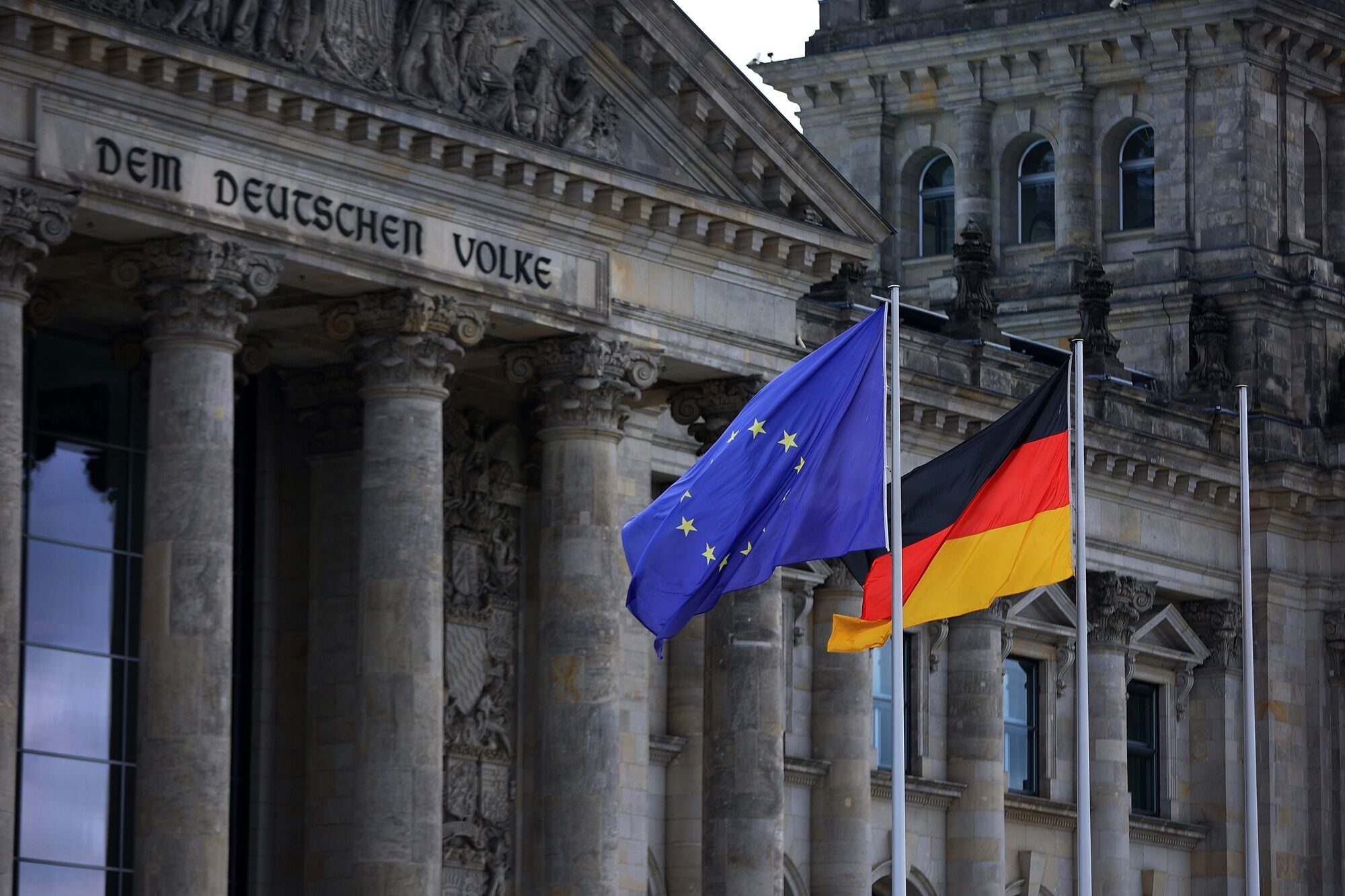 European Union, left, and German national flag outside the Reichstag building in the government district in Berlin, Germany, on Tuesday, Oct. 4, 2022. EU countries are worried that Germany's 200 billion borrowing plan will reopen economic divisions the bloc had managed to bridge during the Covid crisis. Photographer: Krisztian Bocsi/Bloomberg
