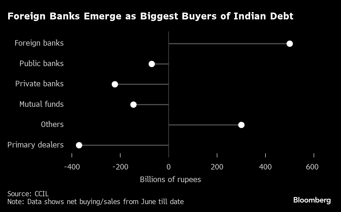 Foreign banks bought local bonds on a net basis for all but four days in June, according to data from the Clearing Corp. They bought 31 billion rupees of notes on Monday, extending the streak for a sixth day. In contrast, state-run banks, mutual funds and private banks have all been net sellers.