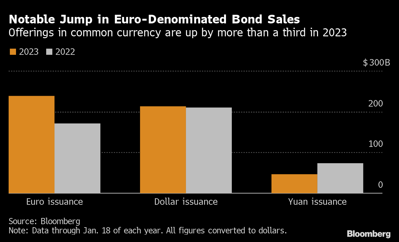 The surge in global bond sales to start the year has been uneven. Debt issuance in euros is smashing records, climbing about 39% compared to a year earlier, according to data compiled by Bloomberg. Dollar bond sales are running roughly in line with last year's robust pace, the data show.