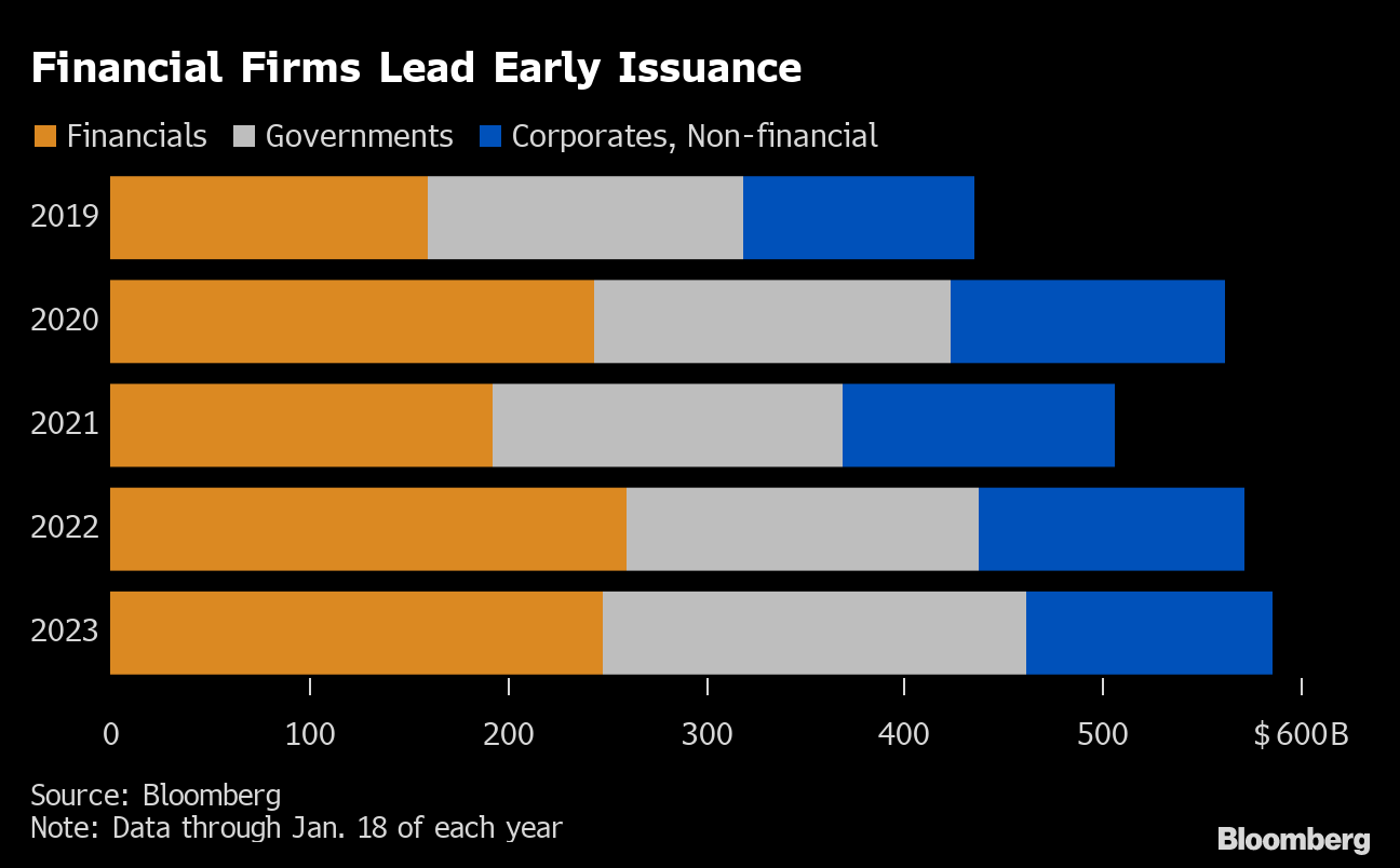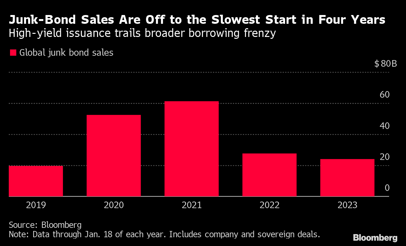 One of the few markets struggling to find its footing in terms of issuance is that for speculative-grade debt. Offerings from high-yield corporate and government issuers are running at the slowest pace since 2019, with about $24 billion priced through Jan. 18. That's likely in part because junk-rated firms that had extended maturities in years past are waiting for interest rates to decline further before taking the plunge. Investor cautiousness about how those borrowers may weather a global recession is also a likely factor.