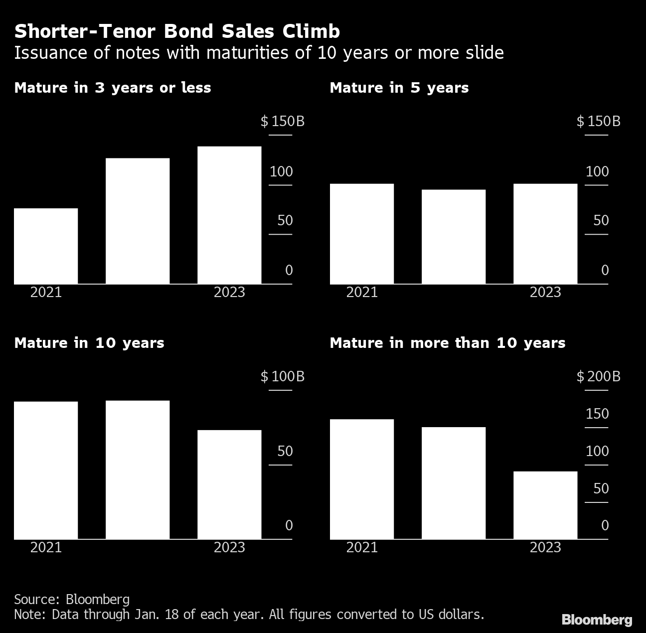 Sales of notes with a three-year tenor or less have climbed more than 80% to $138.5 billion from the same period just two years ago, after yields surged in 2022. By contrast, issuance of bonds with maturities of 10 years or more has slipped.