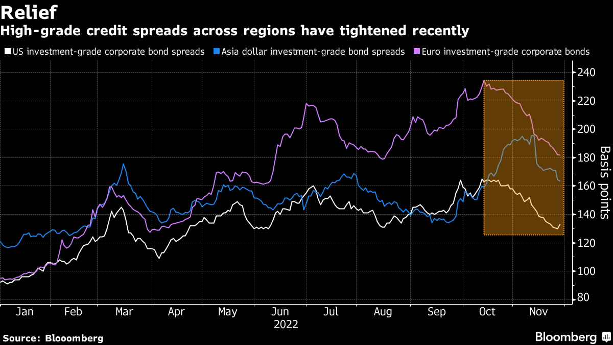 In Europe, investors are also betting on a better year, with spreads declining sharply of late. Yield premiums for euro-denominated corporate bonds have tightened for six consecutive weeks and are now flirting with their lowest level in six months on optimism that rate hikes will slow and amid a rush by investors to capture some of the highest yields in a decade.