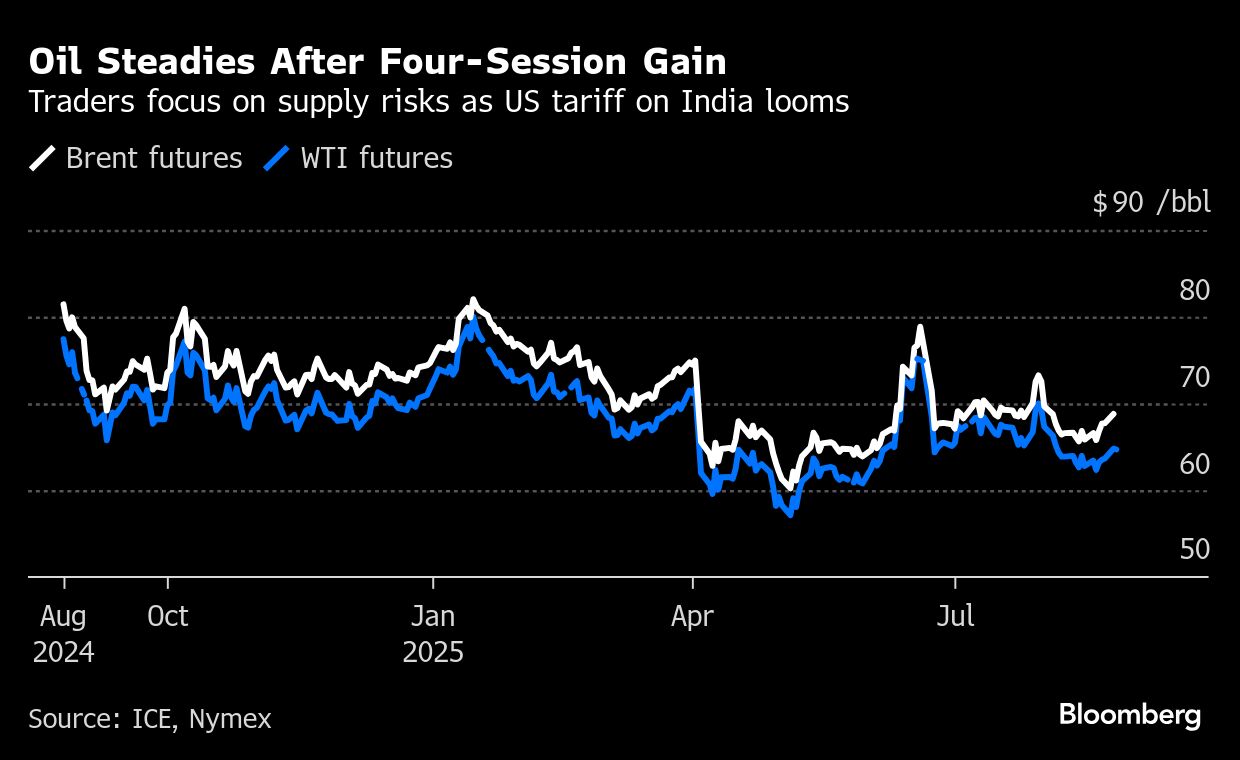 Oil steadied after a four-day advance as investors waited for clearer signals on supplies, with the US poised to double a tariff on all Indian imports to penalize the country for buying Russian crude.