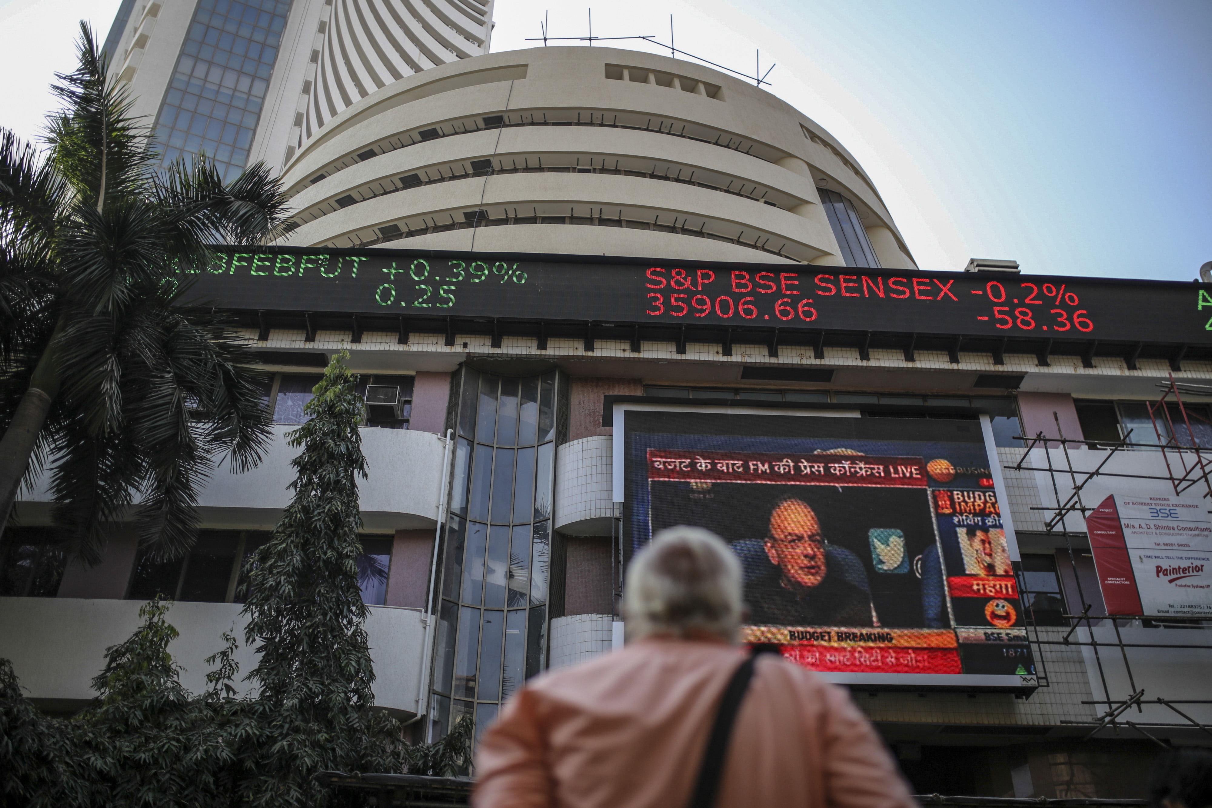 A man looks up at an electronic ticker board showing stock information figures outside the Bombay Stock Exchange (BSE) in Mumbai, India. (Photographer: Dhiraj Singh/Bloomberg)