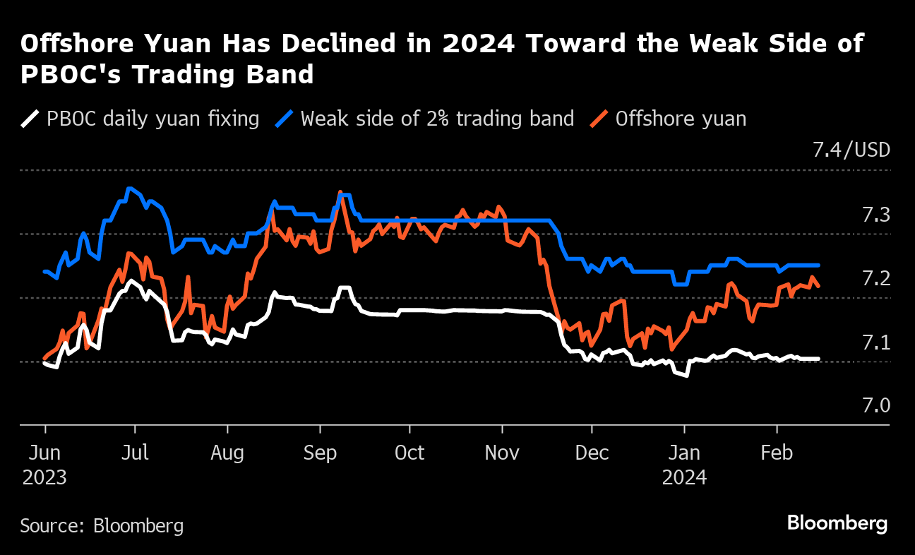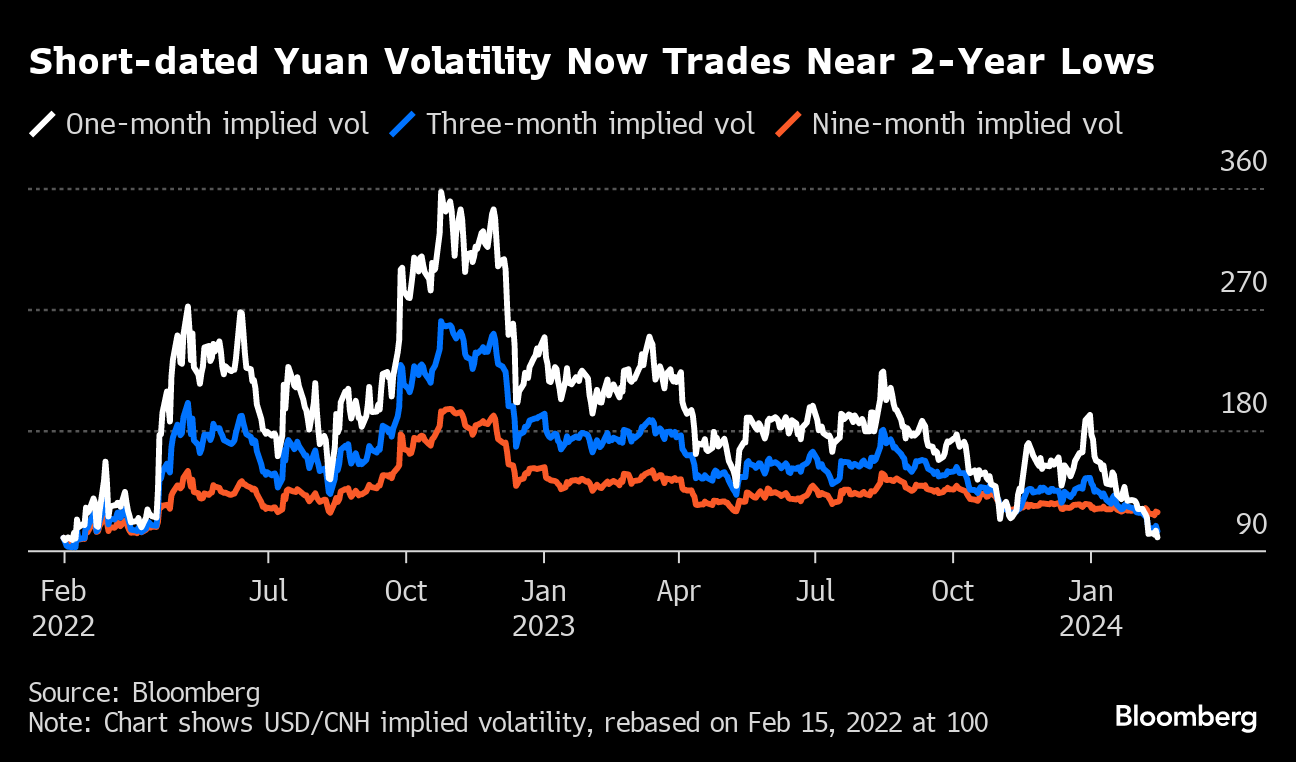 (Bloomberg) -- Investors are scouring the market for cheap hedges against losses in China's yuan, just as the world's second-biggest economy prepares to return from a week-long holiday for the Lunar New Year. With implied volatility across all tenors falling to levels not seen since 2022, options have emerged as the most cost-effective vehicle for protection against a bigger-than-expected yuan depreciation.