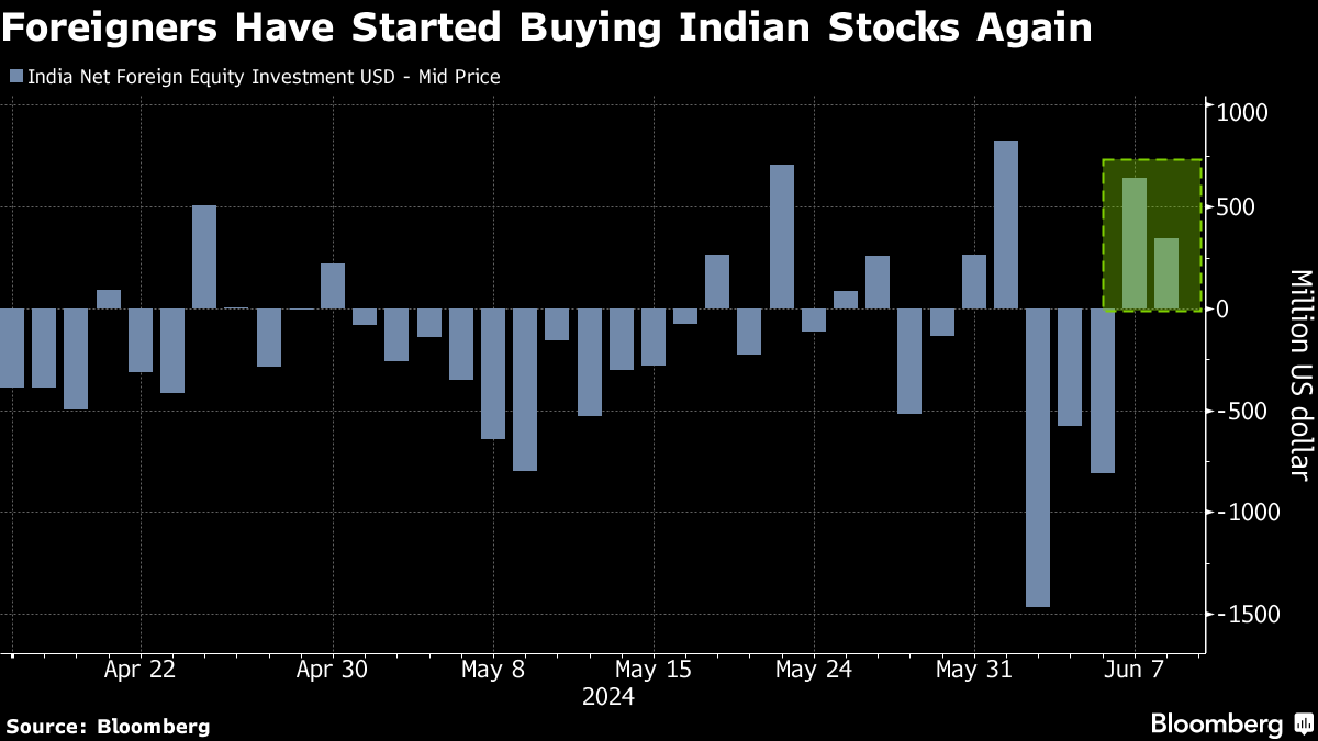 Overseas investors purchased stocks worth a total of $985.5 million on Friday and Monday, according to data compiled by Bloomberg. That helped India's equity benchmark recoup election-related losses and reach a record earlier this week. Their return signals that they may be getting comfortable with valuations in the nation's nearly $5 trillion equity market.