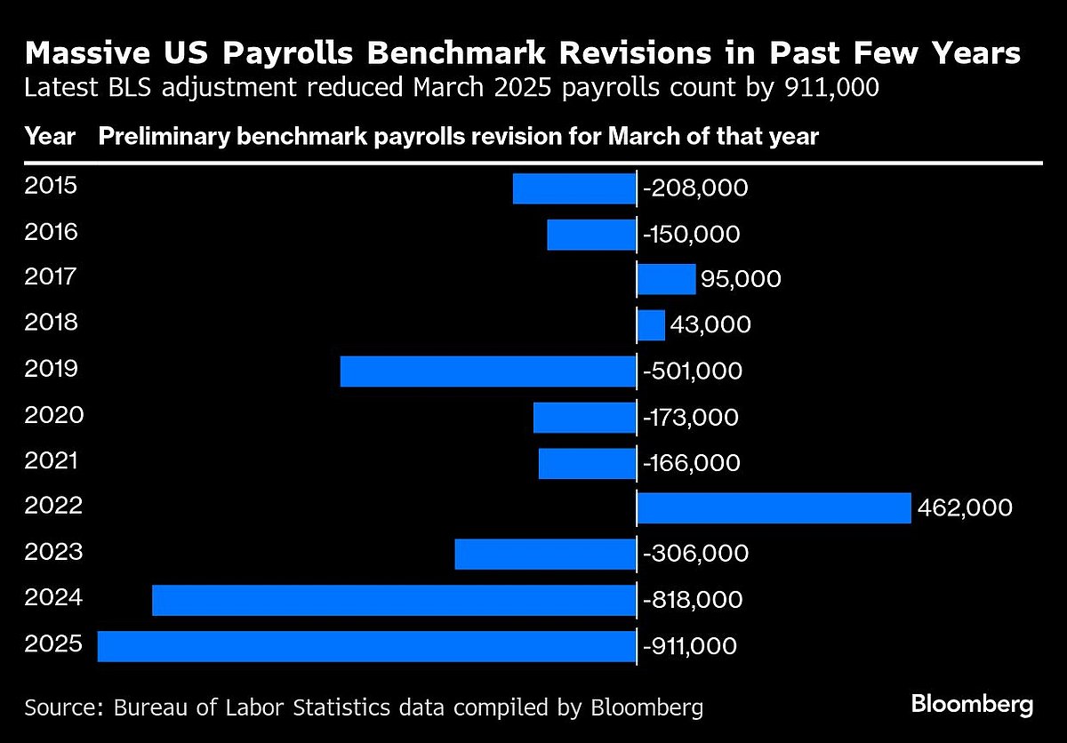 US job growth was far less robust in the year through March than previously reported. The number of workers on payrolls will likely be revised down by a record 911,000, or 0.6%, according to the government’s preliminary benchmark revision out Tuesday. The final figures are due early next year.