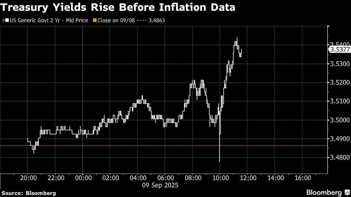 The slide in bonds sent yields higher across the curve, following a four-day rally. The S&P 500 wavered near its all-time highs, with economically sensitive corners of the market underperforming. Apple Inc. dropped before its product event. Oil jumped after an Israeli attack in Qatar revived fears of an escalation of the conflict in the Middle East. Gold rose to a record.