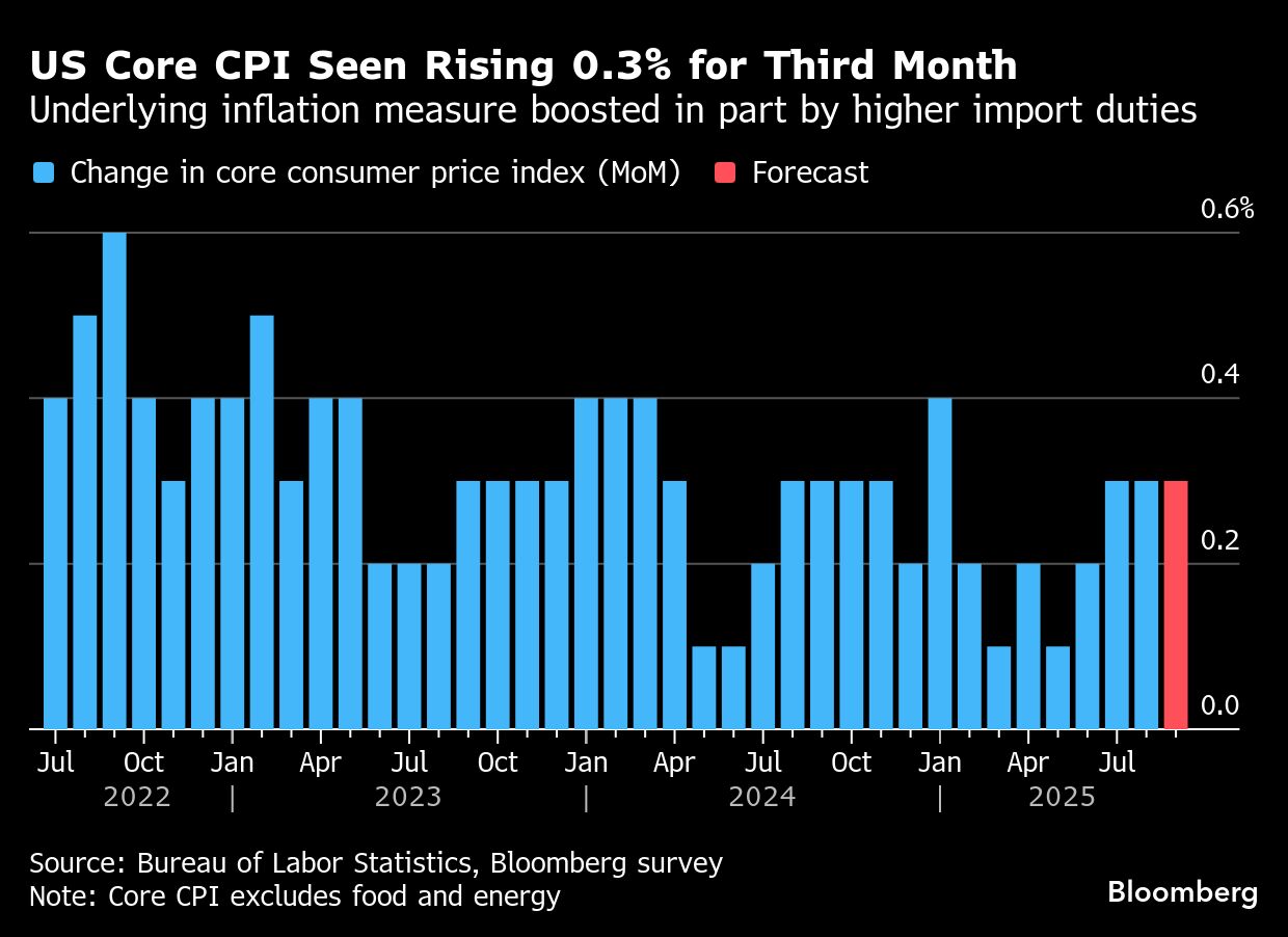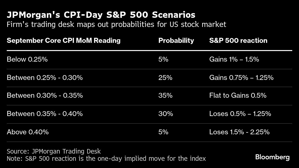 JPMorgan Chase & Co.'s trading desk sees a roughly 65% chance the S&P 500 will advance following the CPI release despite economists expecting an elevated print. The team including Andrew Tyler laid out scenarios for stocks on CPI day that are “less volatile than usual,” with investors' expectations that the Fed will ease again on Oct. 29 likely offsetting any inflation-related angst.