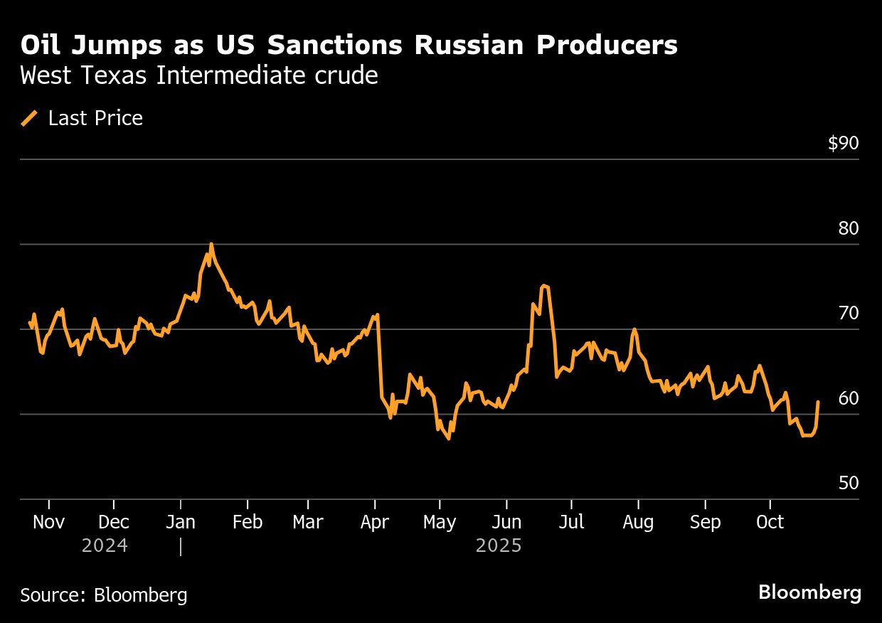 In the run-up to a reading on consumer prices - the first major report since the start of the government shutdown - crude jumped 5% as the US announced sanctions on Russia's biggest oil companies in a bid to end the war in Ukraine. As a result, Treasuries snapped a three-day advance. The S&P 500 bounced, with energy and industrial shares leading the charge.